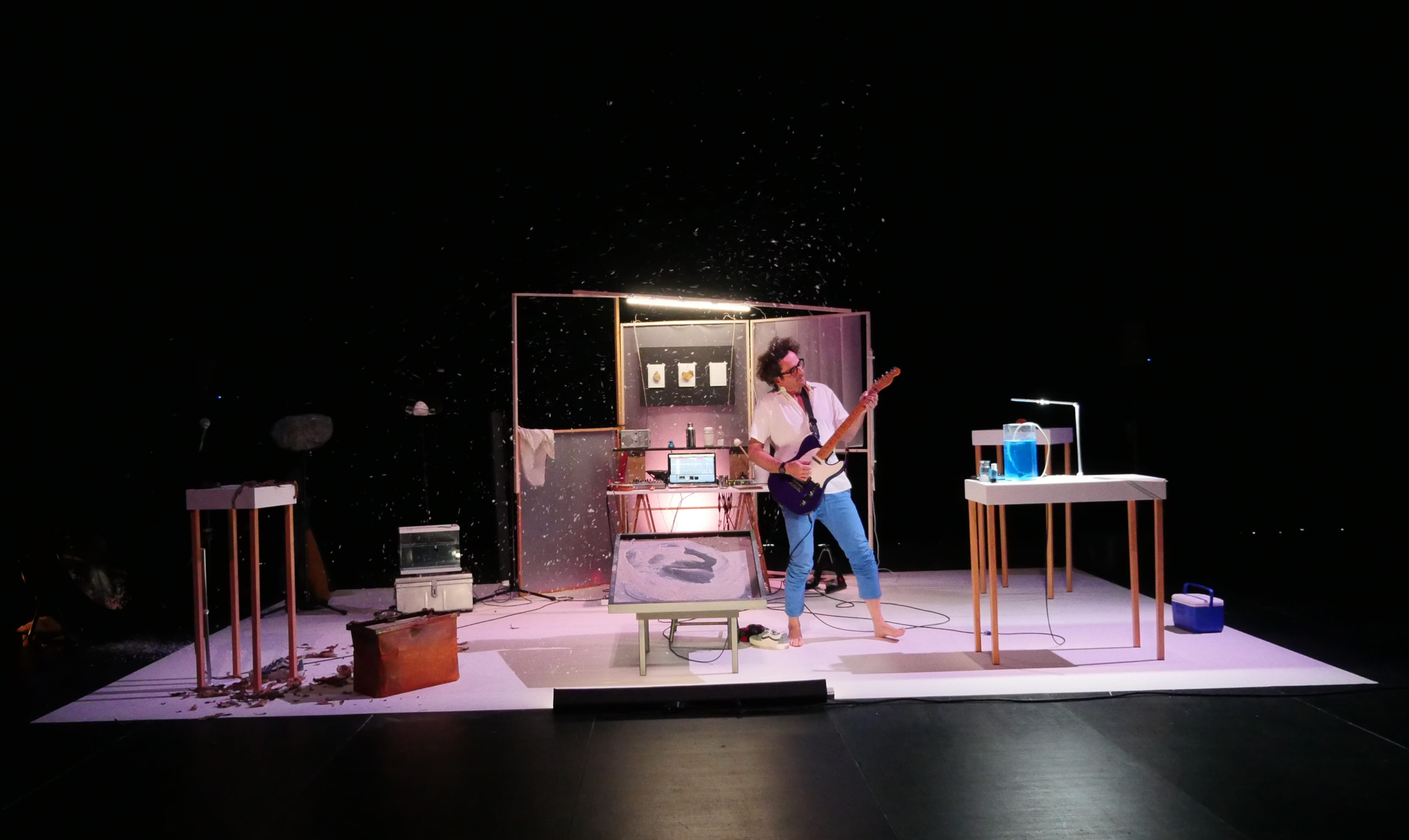 Dans le spectacle La nature ça n’existe pas, le son c’est un peu de la magie. Si l’on frotte un verre préalablement refroidi, c’est un son de grenouille qui peut apparaître à nos oreilles. Si nous diffusons ce son consécutivement dans quatre haut-parleurs c’est une grenouille qui se déplace autour de nous que nous entendons. Et ainsi la narration peut débuter et convoquer les éléments naturels mis en scène. Chaque manipulation visuelle fait naître un personnage sonore qui se déploie dans l’espace. Un paysage sonore progressivement apparaît. Et un élément visuel autonome se déclenche.